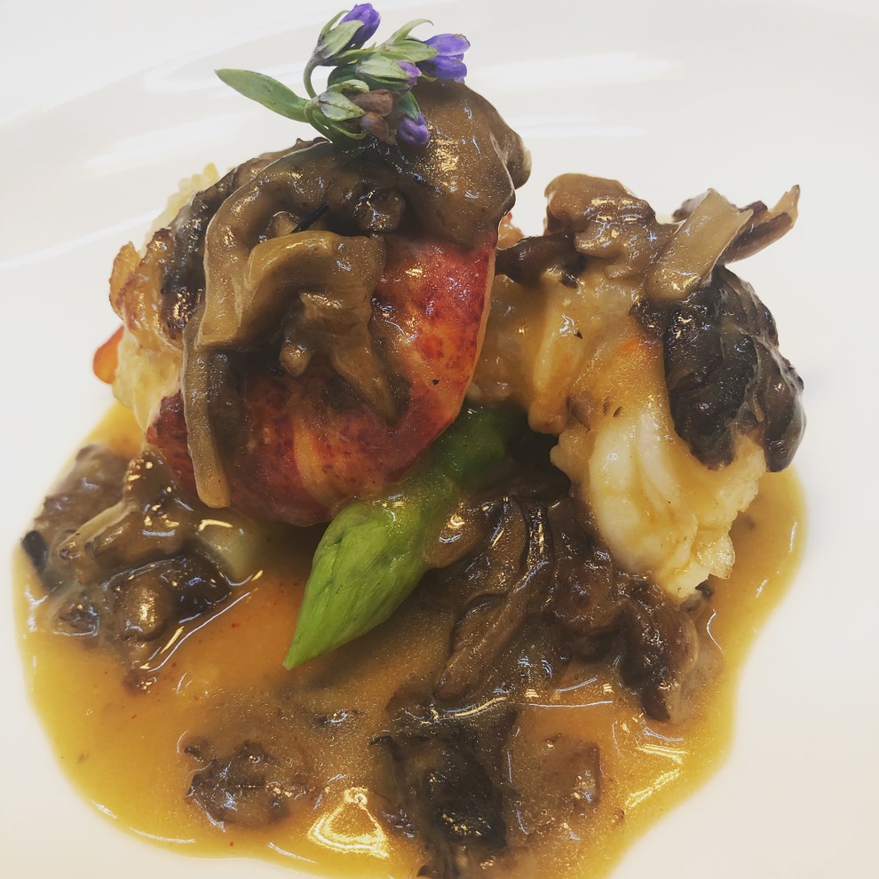 2019/09/01 お知らせ オマール海老のソテー、北海道産ボリボリ茸のアメリケーヌソース オマール海老のソテーに、バターの香りをつけた北海道のボリボリ茸(味噌汁に入れると本当に美味しい)と海老のだし汁を加えたソースです。同じ北海道産のグリーンアスパラとヤングコーンを添えて! News