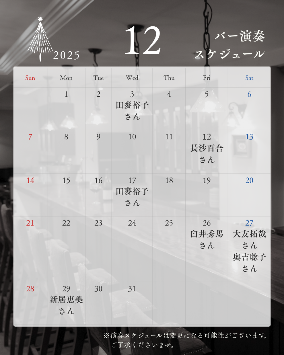 12月 バー演奏スケジュール